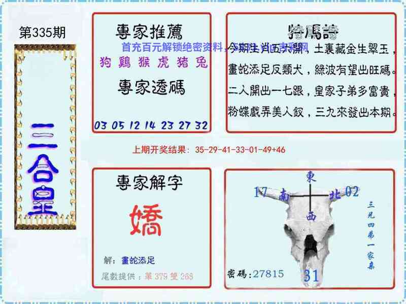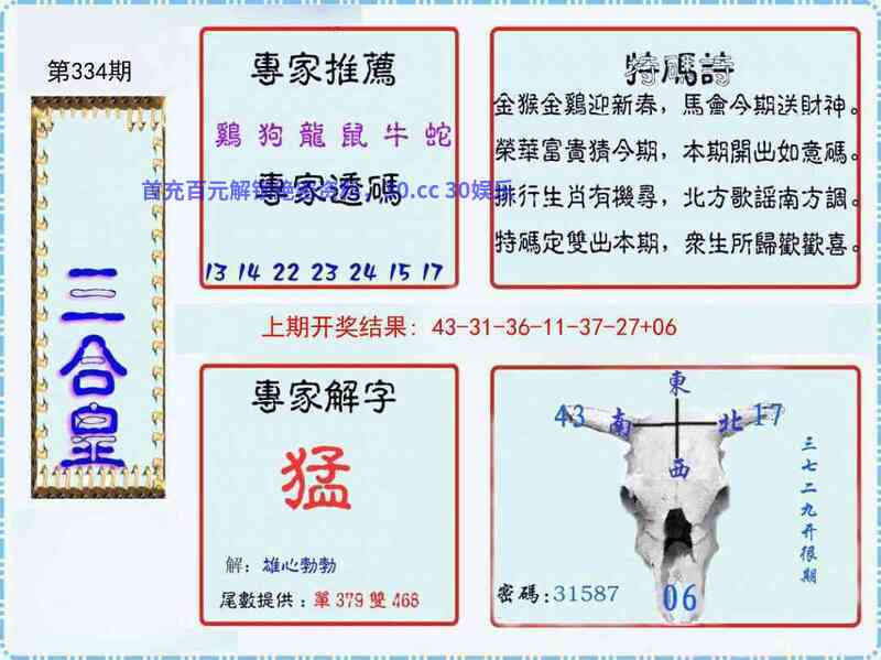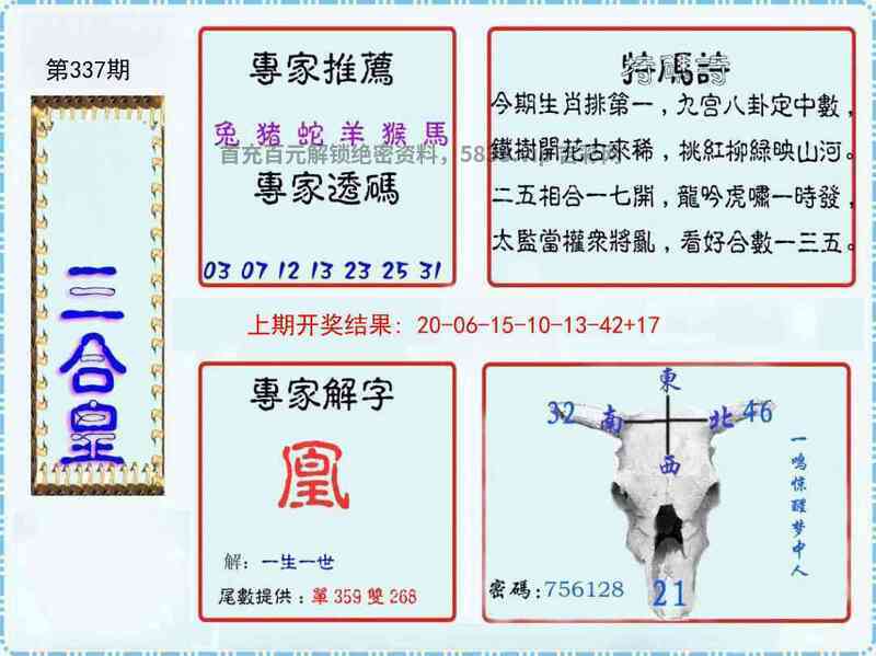 【解三合皇图】开:發00 339期特码诗:單數牛羊鷄猪開,雙數兔馬狗必中,看雙看單還須定,心水還需自己抓。二五四六有玄機,太子美女來相伴,農家都有的動物,牛狗猪羊取一肖。 【专家推荐】虎龙猴猪鸡兔 【专家透码】05.41.28.22.11.13.32 ![]() |